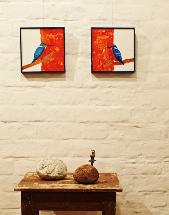 Der er både store og små malerier. Der er tegninger i én-streg samt keramik.